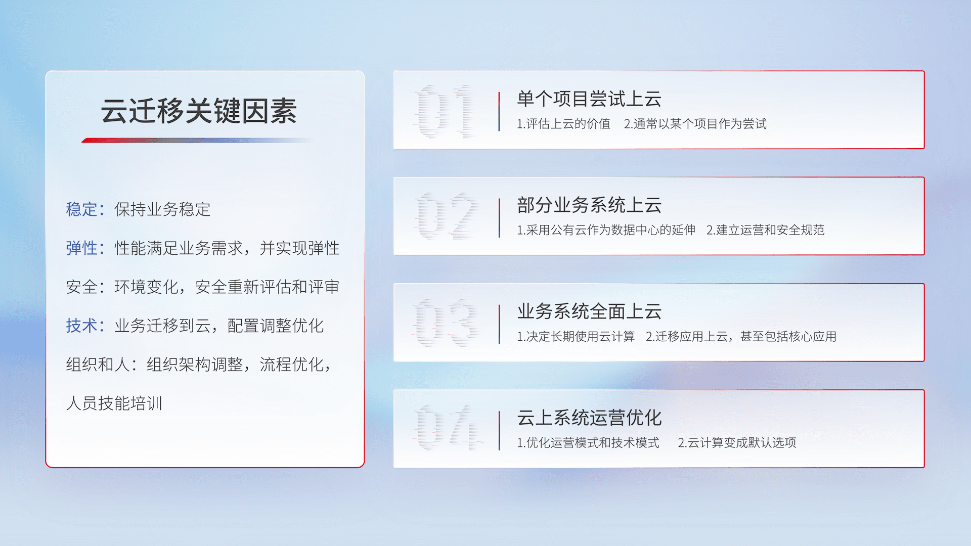 结合实际业务,,从规划设计、、、云平台选型、、、云原生改造、、、数据迁移、、集成交付,,,,迁移全过程为客户识别最佳上云路径,,,,做好风险识别管理,,,,设计网络架构、、身份权限、、安全审计合规、、操作审计、、、、日志审计、、监控告警策略、、、、多站点容灾设计等,,,,对云上基础设施进行整体规划,,,,提升IT治理水平,,以满足弹性、、、、高可用、、高性能的需求。。