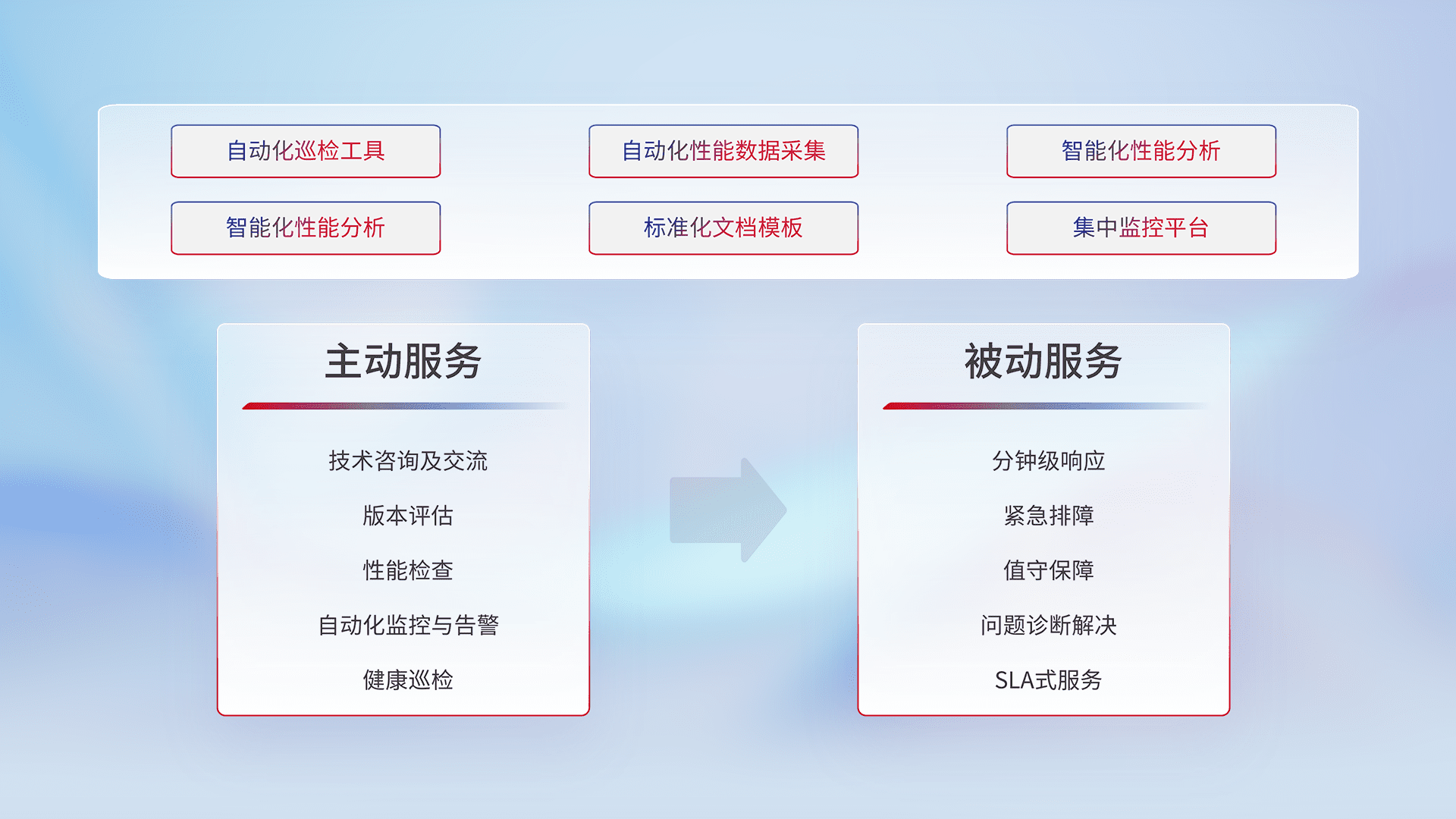 智能化工具和标准化文档,,,,保障服务质量,,,提供主动服务(包含技术咨询、、、、版本评估、、性能检查、、、、自动化监控与告警、、、、健康巡检)和被动服务包含(分钟级响应、、紧急排障、、、、值守保障、、问题诊断解决、、SLA服务)。。。。